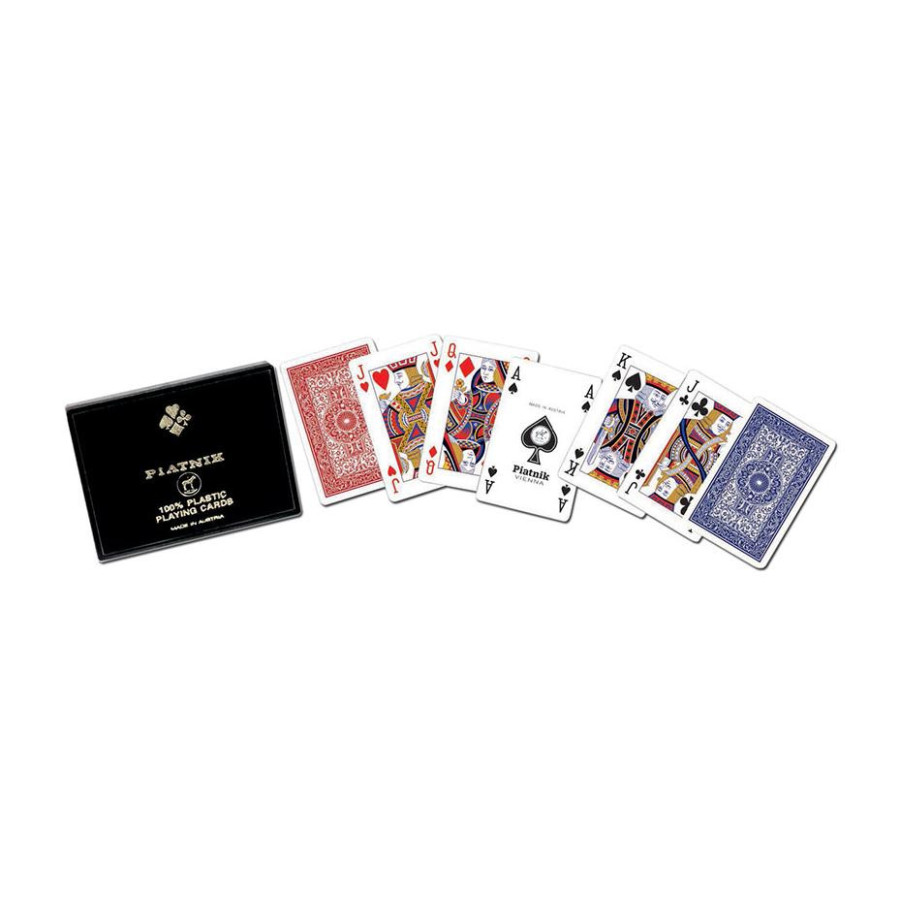 Najwyższej jakości w 100% plastikowe karty renomowanej firmy Ferd. Piatnik & Sohne. Czarne, tradycyjne pudełko zawiera 2 talie, składające się z 55 kart o wymiarach 58 x 89 mm. Idealne zarówno do brydża, pokera, remika jak i innych gier. Wyroby wiedeńskiej fabryki Ferd. Piatnik & Sohne od 1824 roku urzekają bogactwem wzorów i perfekcją wykonania. Jakość i tradycja!