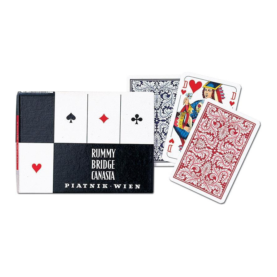Wysokiej jakości karty do gry renomowanej firmy Ferd. Piatnik & Sohne. W komplecie 2 talie (nieco większe) w standardowym Piatnikowskim pudełku. Talie składają się z 55 plastikowanych kart o wymiarach 62 x 91 mm i gramaturze 310. Idealne zarówno do brydża, pokera, remika jak i innych gier. Wyroby wiedeńskiej fabryki Ferd. Piatnik & Sohne od 1824 roku urzekają bogactwem wzorów i perfekcją wykonania. Jakość i tradycja!