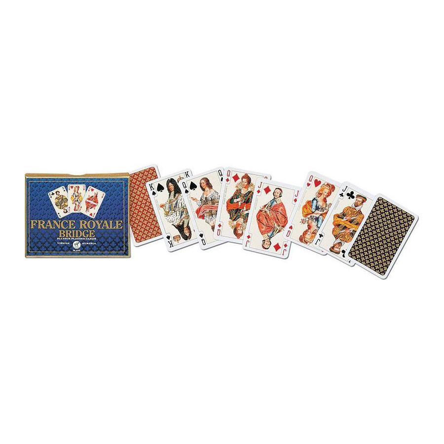 Najwyższej jakości karty do gry renomowanej firmy Ferd. Piatnik & Sohne. W komplecie 2 talie w eleganckim, złoconym pudełku z charakterystyczną Piatnikowską poduszeczką. Na awersach władcy i inne historyczne postaci z Francji. Talie składają się z 55 plastikowanych kart o wymiarach 58 x 89 mm i gramaturze 310. Idealne zarówno do brydża, pokera, remika jak i innych gier. Wyroby wiedeńskiej fabryki Ferd. Piatnik & Sohne od 1824 roku urzekają bogactwem wzorów i perfekcją wykonania. Jakość i tradycja!
