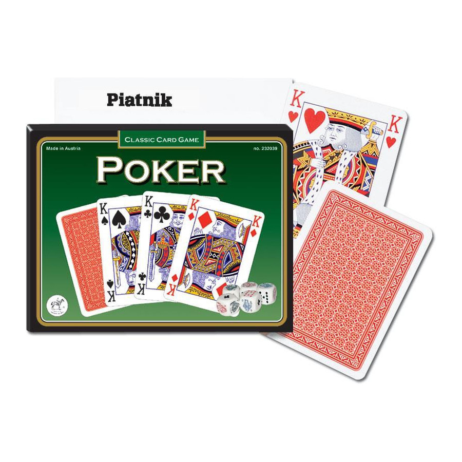 Klasyczne, wysokiej jakości karty i kości do pokera renomowanej firmy Ferd. Piatnik & Sohne. W efektownym Piatnikowskim pudełku talia 55 plastikowanych kart o pokerowym wymiarze 63 x 88 mm i gramaturze 310 oraz 5 kości z figurami. Wyroby wiedeńskiej fabryki Ferd. Piatnik & Sohne od 1824 roku urzekają bogactwem wzorów i perfekcją wykonania. Jakość i tradycja!