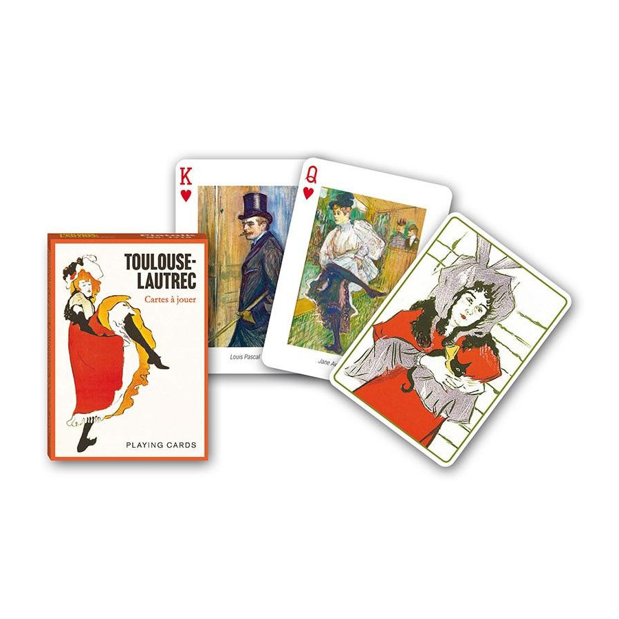 Karty do gry z oryginalnymi awersami przedstawiającymi dzieła malarskie słynnego artysty Henri de Toulouse-Lautrec. Talia składa się z 54 plastikowanych kart o wymiarach 63 x 88 mm.