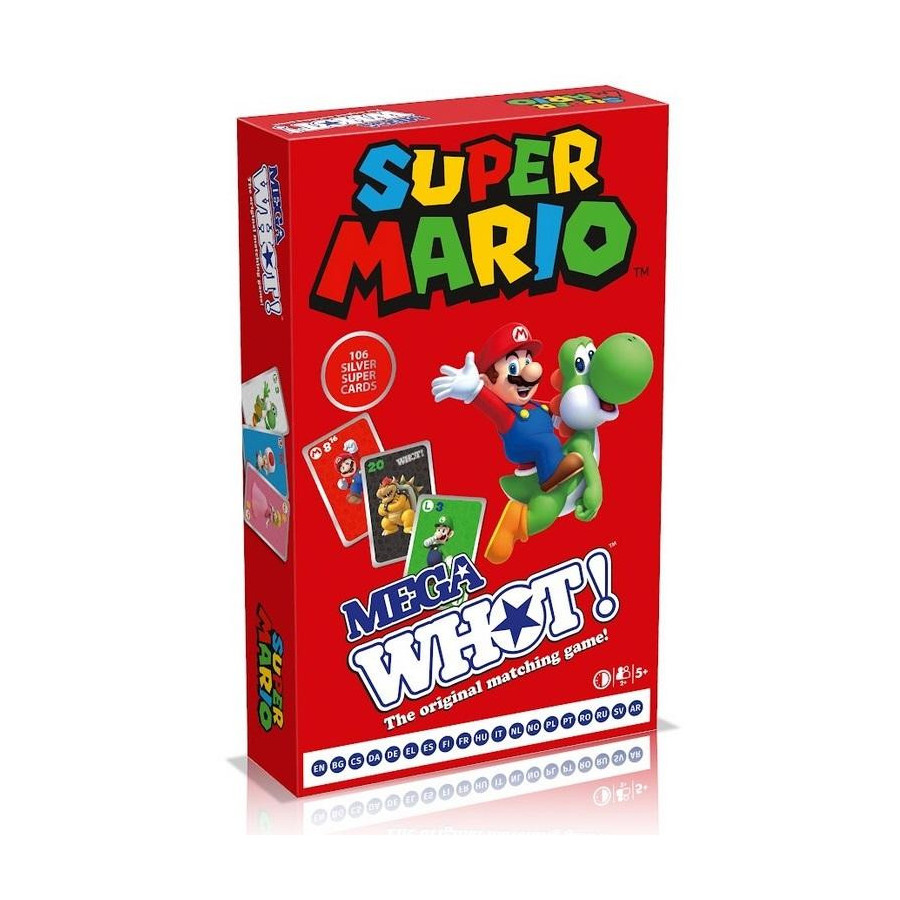 Zaproś przyjaciół i rodzinę z powrotem do Grzybowego Królestwa na zupełnie nowe wyzwanie z Super Mario Mega WHOT! Ta luksusowa edycja oryginalnej gry w dopasowywanie zawiera dwie talie 53 wysokiej jakości kart do gry z unikalnymi detalami z folii oraz niestandardową planszę do gry. Na zmianę dopasowuj kształty, liczby i postacie, w tym Mario, Luigi, Yoshi, Peach i Toad, i bądź pierwszym, który pozbędzie się wszystkich swoich kart. Użyj specjalnych kart Bowser i Bowser Jr. WHOT! które mogą reprezentować dowolną liczbę lub kształt, aby odwrócić przebieg rozgrywki i zakłócić plany przeciwników! Ta specjalna edycja klasycznej gry karcianej to idealny sposób na przerwę od tupania Goombas, więc przygotuj się na popis pamięci, strategii i szybkiego myślenia, aby wygrać. Ten produkt doskonale nadaje się na prezent i zapewnia szybką zabawę dla całej rodziny.