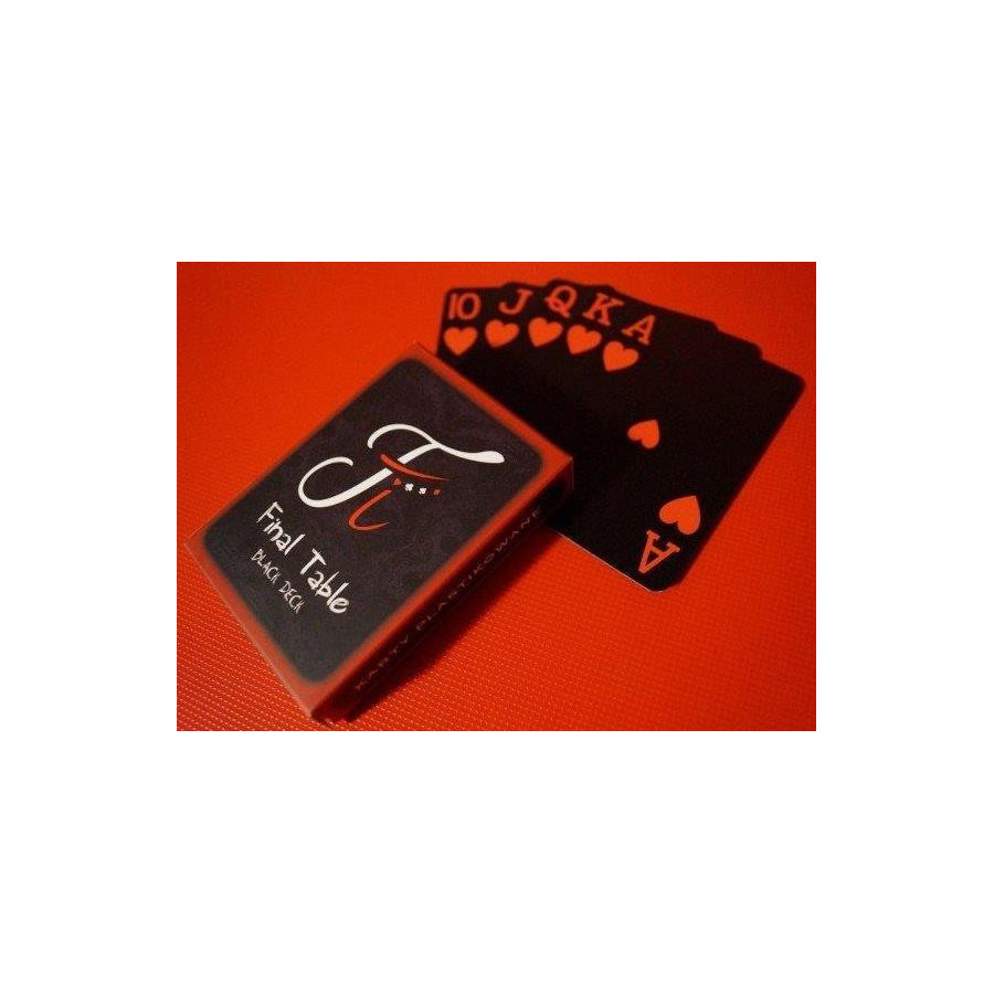 Karty Black Deck FINAL TABLE Dzięki fakturze liniowej idealne do karcianych sztuczek, cardistry. Karty wykonane z profesjonalnego kartonu karcianego, płótnowanego o gramaturze 320 g, podwójnie powlekane lakierem dyspersyjnym (plastikowane). Talia składa się z 55 kart ( 52 + 3 jokery) standardowy rozmiar 63 x 88 mm. Jumbo indeks na przeciwległych narożnikach. Opakowanie pokryte folią matową, napisy lakierowane.