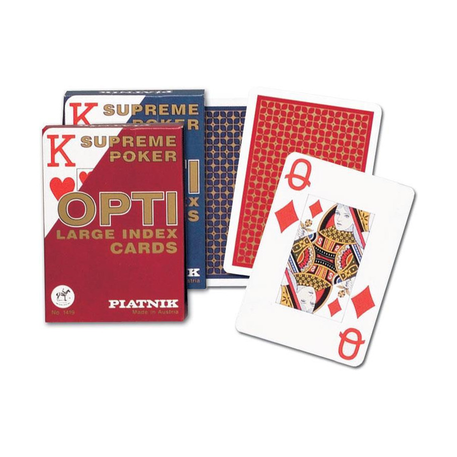 Najwyższej jakości karty do pokera renomowanej firmy Ferd. Piatnik & Sohne. Na awersach powiększone indeksy. Do rozgrywek, w których potrzebna jest lepsza widoczność oraz dla osób słabiej widzących. Talia składa się z 55 plastikowanych kart o pokerowym wymiarze 63 x 88 mm i gramaturze 310. Wyroby wiedeńskiej fabryki Ferd. Piatnik & Sohne od 1824 roku urzekają bogactwem wzorów i perfekcją wykonania. Jakość i tradycja!