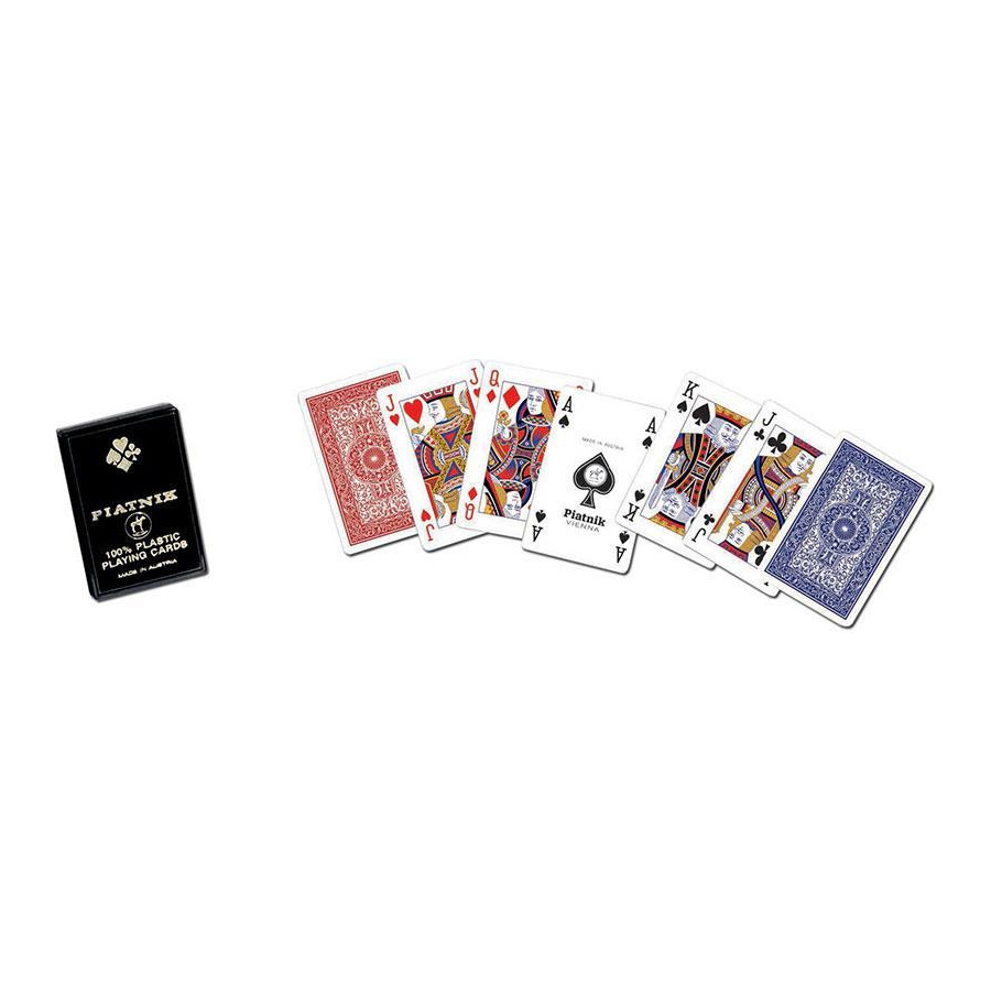 Najwyższej jakości, w 100% plastikowe, karty renomowanej firmy Ferd. Piatnik & Sohne. Czarne, tradycyjne pudełko zawiera talię 55 kart o wymiarach 58 x 89 mm. Wyroby wiedeńskiej fabryki Ferd. Piatnik & Sohne od 1824 roku urzekają bogactwem wzorów i perfekcją wykonania. Jakość i tradycja!