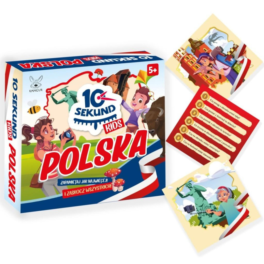 Gra z serii 10 Sekund Kids tym razem o Polsce. Karty dostosowane dla dzieci w wieku 5+. Kto z Was jest najbardziej spostrzegawczy, a kto na najlepsza pamięć? Wytęż wzrok! Masz tylko 10 sekund, aby przypatrzeć się obrazkowi i poprawnie odpowiedzieć co widziałeś. Rzuć kostką, odpowiedź na pytanie i wygraj!