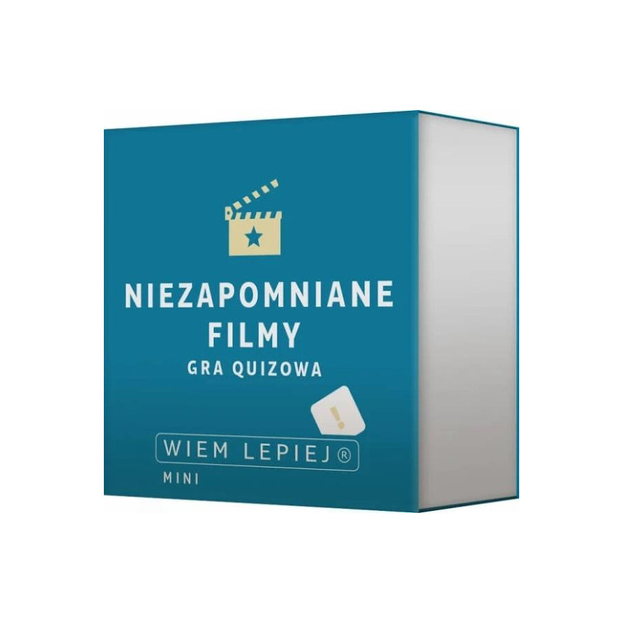 Wiem lepiej: Niezapomniane filmy to 60 pytań, które zabiorą Was w podróż po kinematografii: od tytułów, poprzez ikoniczne sceny aż do popularnych cytatów. Możecie odpowiadać na pytania tylko z tej kategorii, ale też wykorzystać zestaw jako dodatek do taktycznej gry quizowej Wiem lepiej. W pudełku znajdziesz płytkę kategorii, którą możesz dołączyć do puli podstawowych lub zastąpić nią jedną z nich.