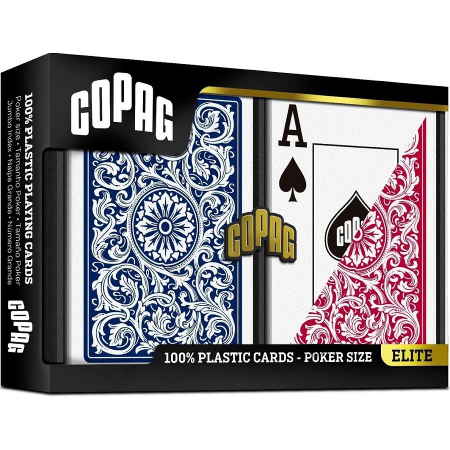 Dwie talie do pokera w kolorze niebieskim i czerwonym wykonane z tworzywa PVC 100% plastik. Całkowicie wodoodporne i o wysokiej klasie elastyczności oraz ścieralności dzięki czemu posłużą ci przez lata. Zestaw pakowany w plastikowe pudełko idealne do ich przechowywania, Każda talia zawiera 52 karty, 2 jokery i 1 kartę gwarancyjną.