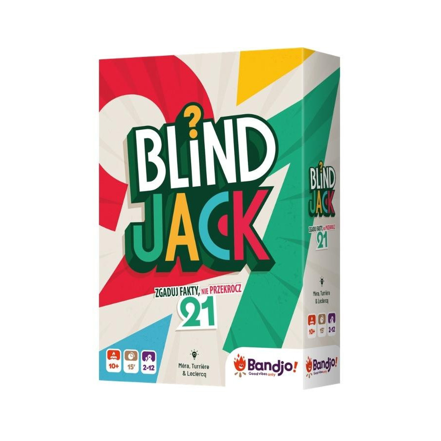 Podążaj za intuicją i poprowadź drużynę do zdobycia sumy jak najbliższej 21 (ale nie większej)! Blind Jack to wyjątkowa gra quizowa, w której wiedza będzie równie przydatna jak umiejętność szacowania. W pudełku znajdziemy talię kart, które z jednej strony mają pytania, a z drugiej odpowiedzi wyrażone w liczbach od 0 do 10. W każdej rundzie drużyna szacuje wartość danej karty i decyduje: wziąć ją, czy spasować. Dopiero na koniec poznamy odpowiedzi, a zwycięży ekipa, która na zebranych kartach będzie miała wynik najbliższy 21 bez przekraczania tej liczby.