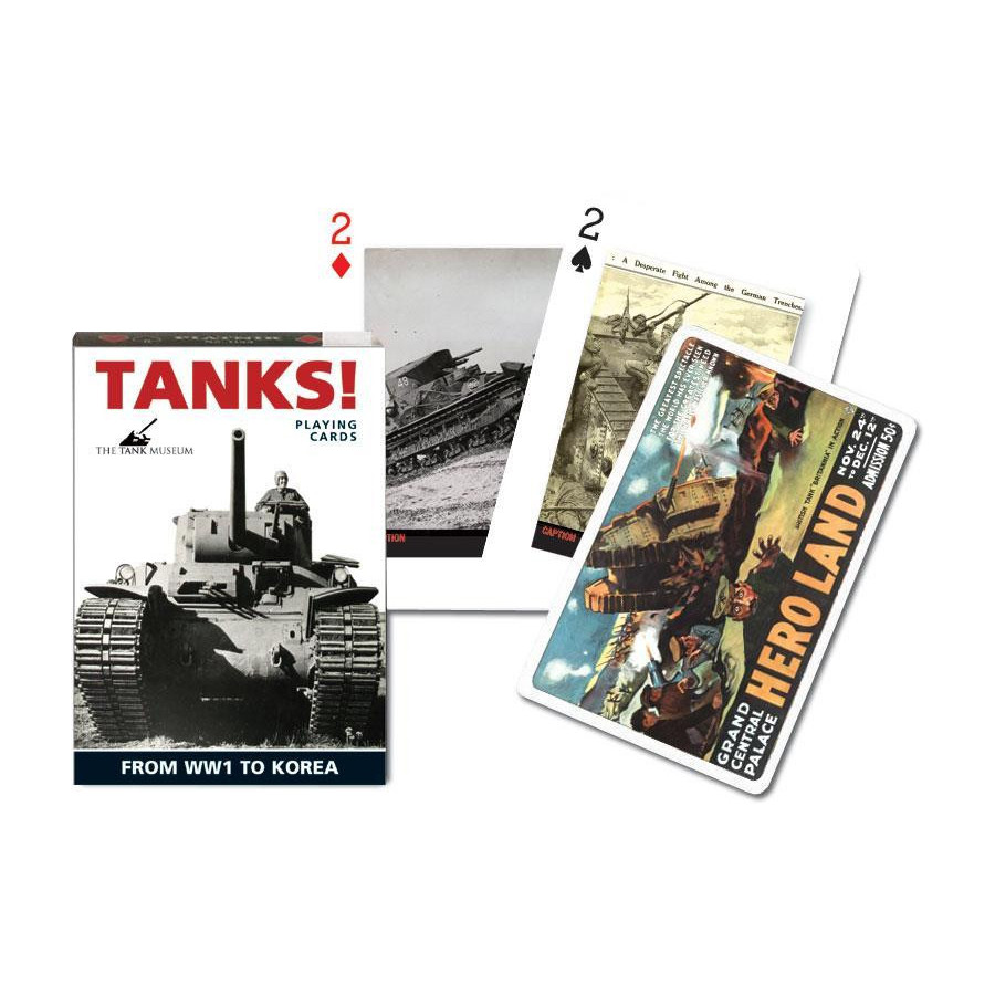 Najwyższej jakości karty do gry renomowanej firmy Ferd. Piatnik & Sohne. Na wszystkich awersach fotografie i plakaty czołgów od czasów I wojny światowej po konflikt w Korei w latach 50. Oprócz mini przewodnika w języku angielskim, pod każdym zdjęciem podpis z datą i parametrami. Talia składa się z 54 plastikowanych kart o wymiarach 63 x 88 mm i gramaturze 310. Idealna zarówno do brydża, pokera, remika jak i innych gier. Wyroby wiedeńskiej fabryki Ferd. Piatnik & Sohne od 1824 roku urzekają bogactwem wzorów i perfekcją wykonania. Jakość i tradycja!