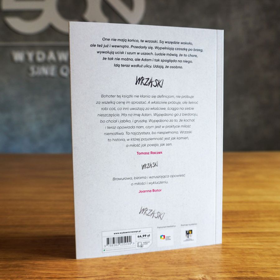 Bohater tej książki nie kłania się definicjom, nie próbuje za wszelką cenę im sprostać. A właściwie próbuje, ale ilekroć robi coś, co inni uważają za właściwe, ściąga na siebie nieszczęście. Ma na imię Adam. Wypędzono go z biedaraju, bo chciał i jabłko, i gruszkę. Wypędzono za to, że kochał, i teraz opowiada nam, czym jest w praktyce miłość niemożliwa. Ta najczystsza, bo niespełniona. Wrzaski to historia, w której przyziemność jest jak kamień, a miłość jak poezja, jak sen.