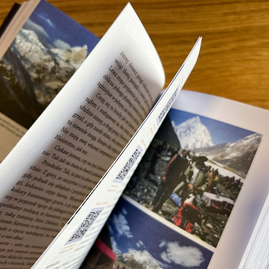Jednak tym razem w Himalaje przenoszą czytelników nie tylko emocjonujące opisy i ponad setka fotografii, lecz również przygotowane specjalnie do książki filmy. Ponad 30 kodów QR prowadzi do wyjątkowych nagrań i pozwala czytelnikowi zostać jednym z uczestników wyprawy, zobaczyć prawdziwe życie w bazie, usłyszeć szum strumienia podczas trekkingu i zasmakować widoku ze szczytu. A także zobaczyć to, czego słowa nie potrafią opisać.