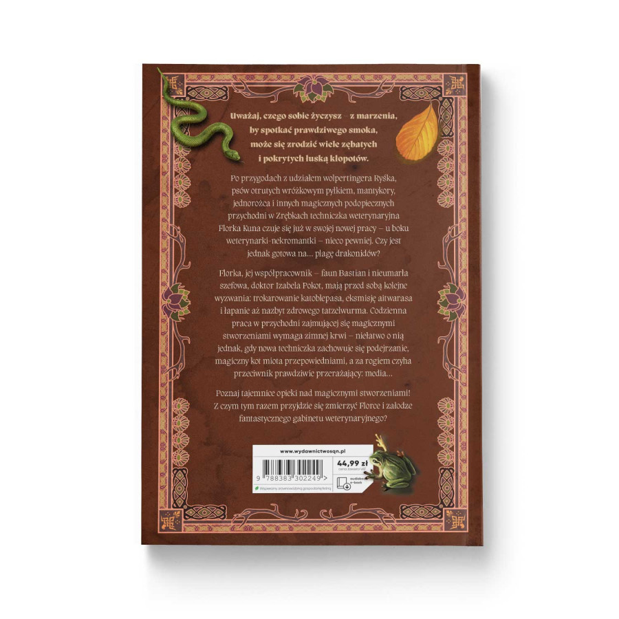 Ostrzegano ją, żeby uważała, czego sobie życzy. Marzenie o spotkaniu z prawdziwym smokiem przyniosło jej więcej kłopotów, niż była w stanie sobie wyobrazić. Po niebezpiecznych przygodach z wolpertingerem Ryśkiem, psami otrutymi wróżkowym pyłkiem, mantykorą, jednorożcem i innymi magicznymi podopiecznymi przychodni w Zrębkach, Florka Kuna, techniczka weterynaryjna, zaczynała czuć się coraz pewniejsza w swojej nowej pracy u boku weterynarki-nekromantki. Ale czy kiedykolwiek można być zupełnie gotowym na plagę drakonidów?