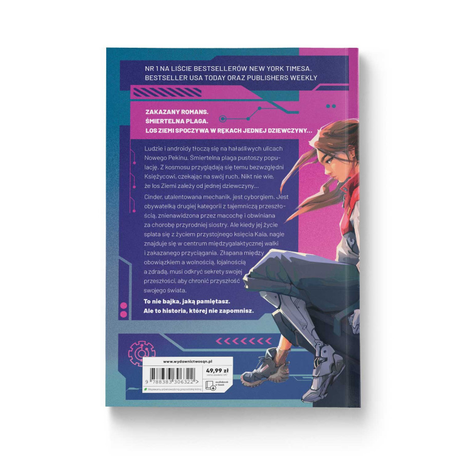 Cinder, utalentowana mechanik, to cyborg. Była obywatelką drugiej klasy, z tajemniczą historią, nielubianą przez macochę i obwinianą za chorobę przyrodniej siostry. Jednak gdy jej los splata się z księciem Kaiem, nagle staje w samym centrum międzygalaktycznej batalii i zakazanej miłości. Uwięziona między obowiązkiem a wolnością, lojalnością a zdradą, musi odkryć sekrety swojej przeszłości, by zapewnić przyszłość swojego świata.
