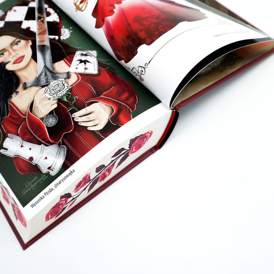- Mroczna atmosfera i baśniowy klimat: Książka balansuje między magią a grozą, co przyciąga fanów baśniowych opowieści z mrocznym twistem. Autorka zgrabnie wplata w fabułę znane motywy z Alicji w Krainie Czarów — Kota z Cheshire, Kapelusznika czy Karcianych Żołnierzy, ale nadaje im nową głębię i kontekst.