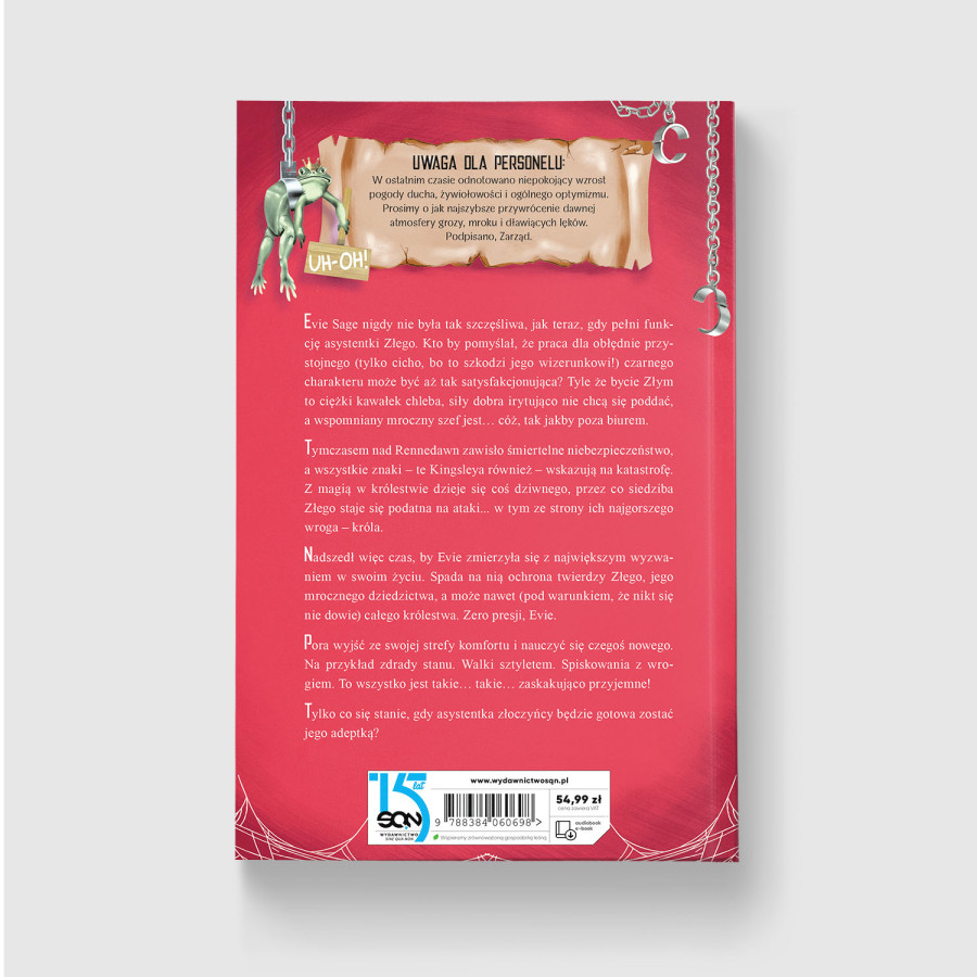 Evie, nasza ulubiona, promienna jak letnie słoneczko asystentka Złego dostaje awans na adeptkę – a to oznacza nowe przygody, stare tajemnice, trochę bolesnych prawd i Tristana, który... za wszelką cenę próbuje ukryć przed światem, że na widok swojej najradośniejszej pracownicy miękną mu kolana. Nic mnie tak nie rozczula, jak ponury Zły, który usiłuje udawać, że nie jest totalnym misiem-pysiem! No, może tylko żaba z tabliczką ;)