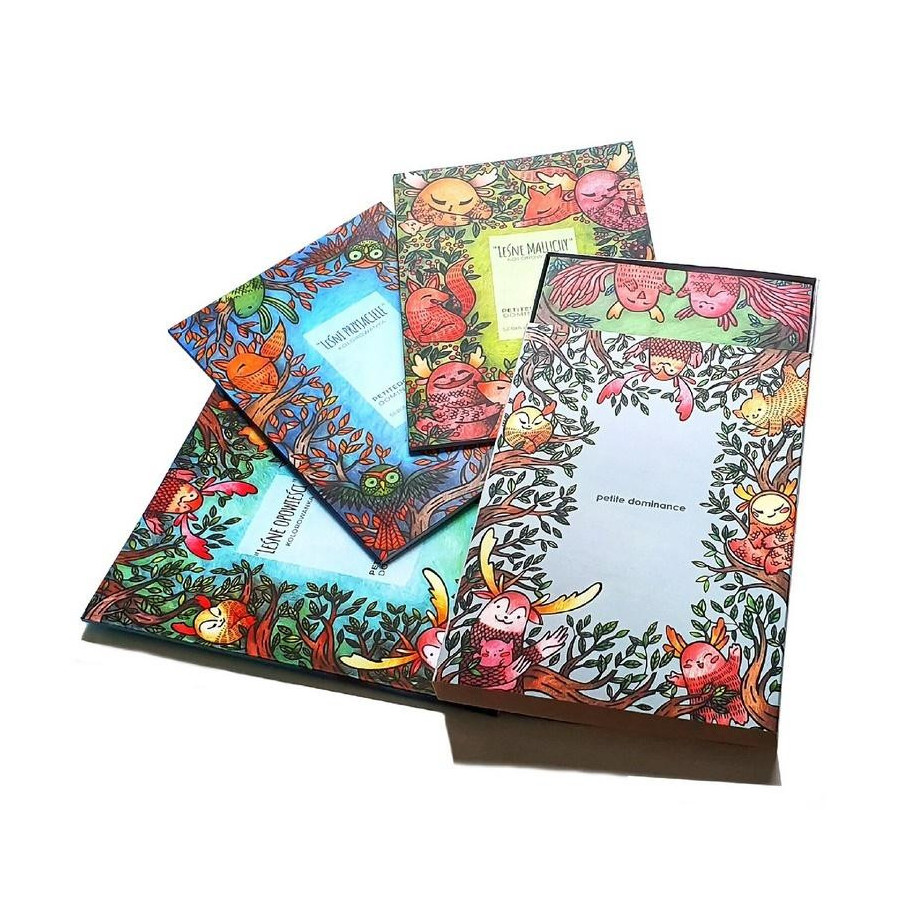 Zestaw kolorowanek złożony z czterech tomów z serii Leśne opowieści zapakowanych w ozdobne pudełko (tom 1 "Leśne opowieści", tom 2 "Leśni przyjaciele", tom 3 "Leśne maluchy", tom 4 "Leśne gry"). Wszystkie ilustracje powstały ręcznie, z najwyższą dbałością o szczegóły. Ich indywidualny styl sprawia, że jest to produkt wyjątkowy i niepowtarzalny. Cała seria została wydrukowana w Polsce, na papierze o gramaturze 200 g posiadającym certyfikat ekologiczny FSC. Kartki sklejone są tak, aby łatwo było je rozłożyć i w razie potrzeby - wyrwać. Pokolorowany obrazek stanie się wtedy ozdobą ściany lub spersonalizowanym prezentem dla najbliższych. Kolorowanki Petite dominance to gwarancja wspaniałej, rozwijającą zabawy, która wciągnie na długie chwile i podbije serca dzieci i dorosłych!