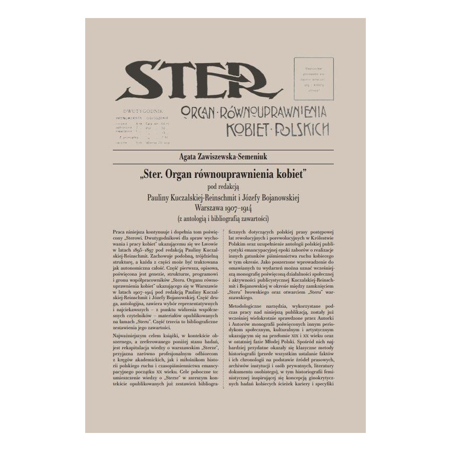 Praca niniejsza kontynuuje i dopełnia tom poświęcony Sterowi. Dwutygodnikowi dla spraw wychowania i pracy kobiet ukazującemu się we Lwowie w latach 18951897 pod redakcją Pauliny Kuczalskiej-Reinschmit . Zachowuje podobną, trójdzielną strukturę, a każda z części może być traktowana jak autonomiczna całość. Część pierwsza, opisowa, poświęcona jest genezie, strukturze, programowi i gronu współpracowników Steru. Organu równouprawnienia kobiet ukazującego się w Warszawie w latach 19071914 pod redakcją Pauliny Kuczalskiej-Reinschmit i Józefy Bojanowskiej. Część druga, antologijna, zawiera wybór reprezentatywnych i najciekawszych z punktu widzenia współczesnych czytelników materiałów opublikowanych na łamach Steru. Część trzecia to bibliograficzne zestawienia jego zawartości.