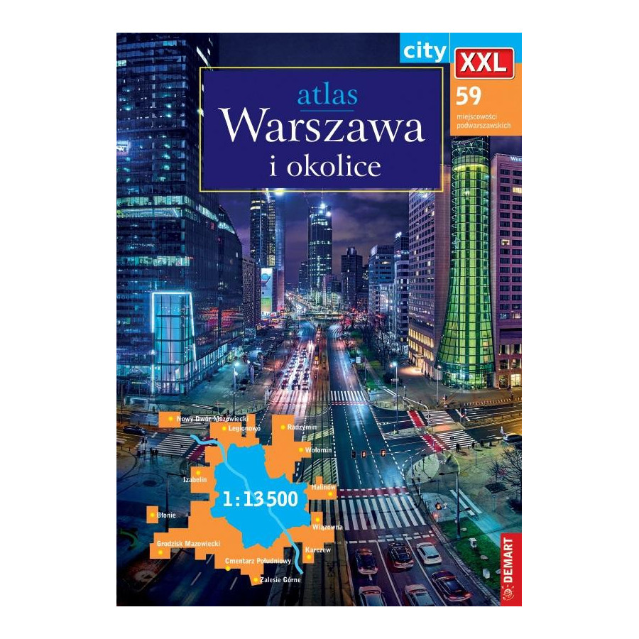 Atlas Warszawy w skali 1:13 500, wzbogacony o plany 59 okolicznych miast i miejscowości w skali 1: 17 000, przedstawiający aglomerację w promieniu 20 kilometrów. Zawiera m.in.: ulice jednokierunkowe, sygnalizację świetlną, linie komunikacyjne, ulice w budowie, ulice projektowane, parkingi, bankomaty, ścieżki i szlaki rowerowe, stacje rowerów miejskich