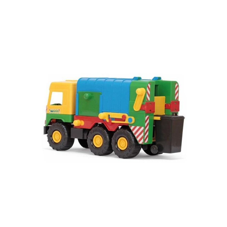 Pojazd posiada wiele ruchomych elementów, które urozmaicą zabawę np. kontener na śmieci, podnośnik umożliwiający opróżnianie kontenera oraz otwieraną tylną klapę.