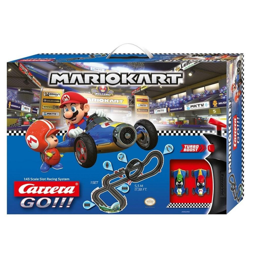 W zestawie znajduje się: - Nintendo Mario Kart Mach 8 - Mario 64148 - Nintendo Mario Kart Mach 8 - Luigi 64149 - 1 Szyna przyłączeniowa -1 Transformator -2 Kontrolery - zwężenie oraz skrzyżowanie - pochyły zakręt - pętla - licznik okrążeń -zapasowe wymienne szczotki stykowe i prowadnice - instrukcja PL Rozmiary po rozłożeniu: 160 x 95 cm Długość toru: 5,3 m Carrera GO!!! to system startowy do Świata Wyścigów Carrera, stworzony w skali 1:43. Wszystkie zestawy z tej serii zawierają kontroler turbo doładowania, a także oryginalne, licencjonowane samochody, wykonane z ogromną dbałością o szczegóły. Do każdego z nich dołączony jest zawsze dodatkowy zestaw szczotek stykowych. Systemy torów są niezwykle łatwe w montażu i demontażu, dzięki unikalnemu systemowi zatrzasków.