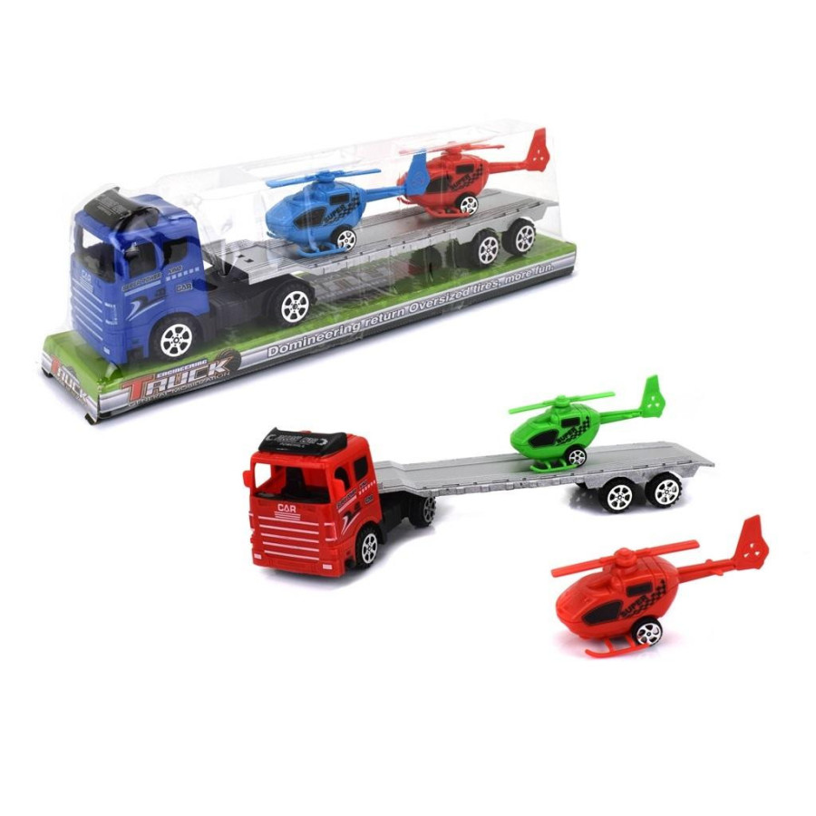 Ciężarówka została wyposażona w długą, otwieraną rampę, na której możecie przewozić helikopter, jak i inne pojazdy. Ciężarówka z lawetą to masa zabawy dla każdego dziecka. Lawetę można odczepić od ciężarówki. Opakowanie typu Window Box ułatwia zapoznanie się z funkcjami zabawki. Helokoptery posiadają 2 kółka, które ułatwią poruszanie się po powierzchni.