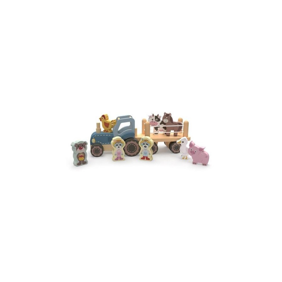 Drewniany traktor z przyczepką na licencji Babies and the Bear.Zestaw zawiera figurki Bobasków, Misia oraz 5 zwierząt: świnkę, krowę, konia, kaczkę, kurę.Traktor posiada obrotowe koła oraz odpinaną przyczepkę.Figurki Bobasków i Misia mieszczą się do kabiny traktora, a zwierzątka mogą być przewożone na przyczepce.Drewniane figurki zachęcają do odgrywania ról na farmie, rozwijając wyobraźnię dziecka.Zabawa wpiera rozwój małej motoryki i wzmacnia odruch chwytania.Wszystkie materiały wykorzystane do stworzenia zabawki posiadają atesty, a także zostały pomalowane nietoksycznymi farbami.Drewniane elementy wykonane są z drewna z certyfikatem FSC.Idealna zabawka dla dzieci od 18 miesiąca życia.