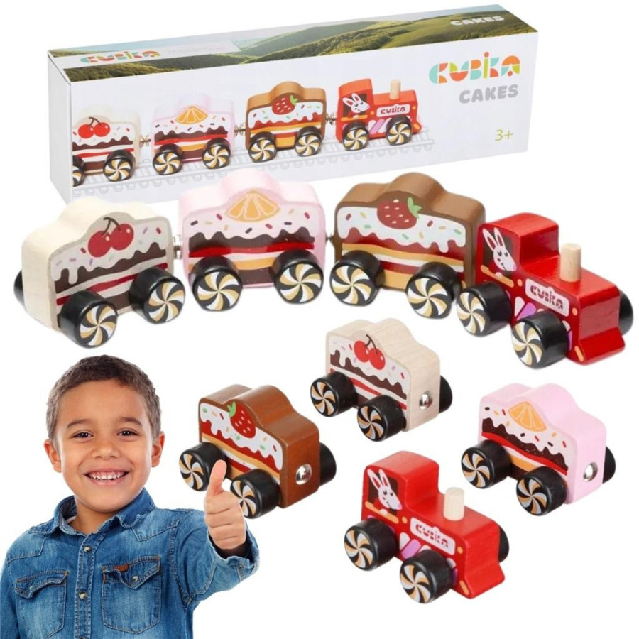 Niezwykły drewniany pociąg z motywem ciast to świetna zabawka dla maluchów, która nie tylko zapewni mnóstwo rozrywki, ale również posłuży w sposób edukacyjny.