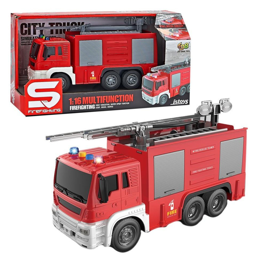 Straż pożarna z drabiną, pryskająca wodą. Otwierane boczne drzwiczki. Efekty dźwiękowe i świetlne. Skala - 1:16 Wymagane baterie: 3xAG13 (dołączone)
