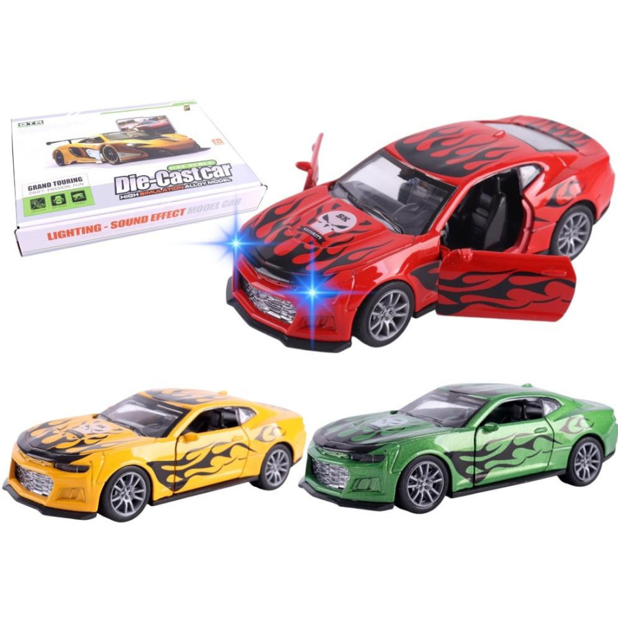 Metalowy samochód sportowy w skali 1:32 to dynamiczny model inspirowany muscle carami, który łączy realistyczne detale z efektami świetlnymi i dźwiękowymi. Jego metalowa konstrukcja zapewnia trwałość, a precyzyjnie odwzorowane wnętrze i agresywne malowanie z płomieniami dodają mu charakteru. Model wyposażony jest w funkcję pull-back, otwierane drzwi oraz światła LED, które rozświetlają reflektory podczas jazdy.