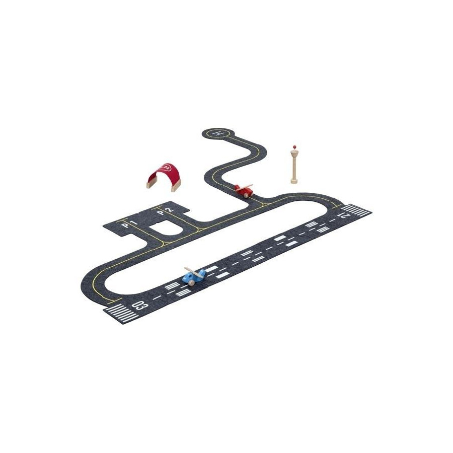26-elementowy zestaw (drewniane i filcowe części) tworzy realistyczne lotnisko. Dzieci uczą się organizacji ruchu samolotów i pasażerów, rozwijając zdolności planowania oraz koordynację. Zabawa zachęca do kreatywnego myślenia i poznawania zasad podróżowania.