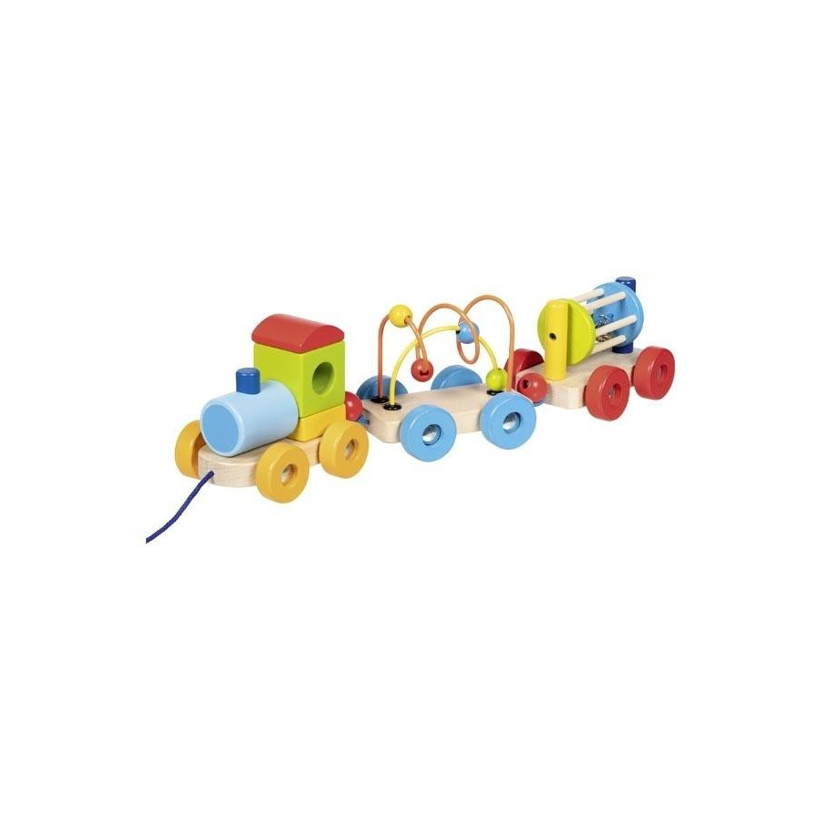 Drewniany pociąg składający się z 7 elementów wagoników z klockami, labiryntu koralikowego i grzechotki. Każdy moduł oferuje inną formę aktywności, wspierając rozwój sensoryczny, manualny i koordynację.
