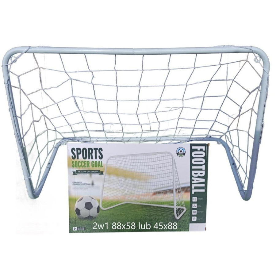 Metalowa, wolnostojąca bramka piłkarska w kolorze białym. W zestawie siatka do bramki. Po złożeniu bramka o wymiarach 88x58x43 [cm]. Doskonała i solidnie wykonana zabawka ogrodowa dla najmłodszych fanów piłki nożnej.