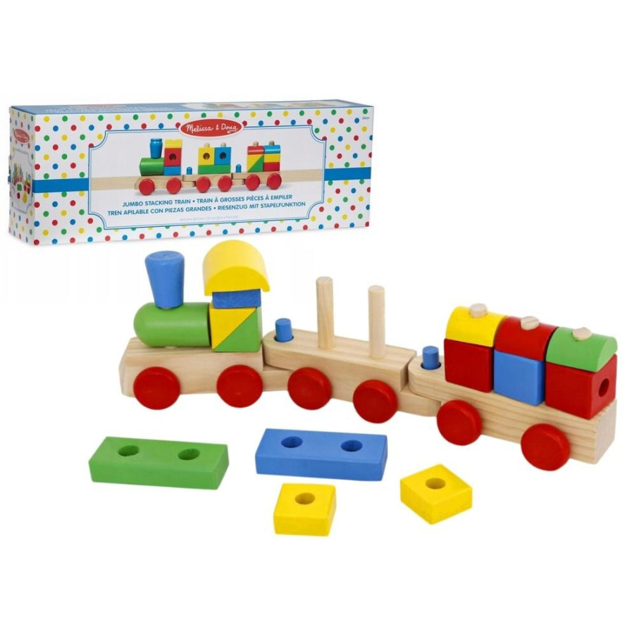 Ten kolorowy drewniany pociąg Jumbo od marki Melissa & Doug to połączenie klasycznej zabawki do ciągnięcia z funkcją edukacyjnej układanki. Składa się z trzech wagoników, które można łączyć i rozdzielać, oraz ponad 15 klocków w różnych kolorach i kształtach, które dziecko może układać według własnych pomysłów. Zabawa tym pociągiem to nie tylko radość z jazdy, ale także doskonałe ćwiczenie zdolności manualnych, logicznego myślenia i koordynacji wzrokowo-ruchowej.