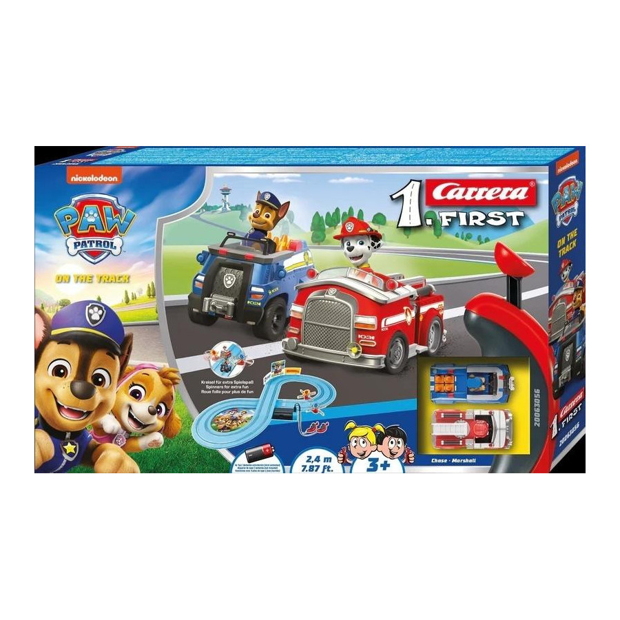 Najmłodsi kierowcy wyścigowi mogą teraz wyruszyć na nową przygodę z dzielnymi psami Chase'em i Marshallem. Tor Carrera FIRST "PAW Patrol - Na torze" przenosi bohaterów PAW Patrol wprost do pokoju dziecięcego. Na torze o długości 2,4 metra Chase i Marshall ścigają się swoimi pojazdami ratunkowymi przez ekscytujące zakręty, szybkie proste i trudne przejścia. Zabawny bączek zapewnia dodatkową akcję i pozwala dzieciom doświadczyć na własnej skórze, jak to jest być częścią misji ratunkowej. Kolorowe elementy dekoracyjne z serii PAW Patrol tworzą autentyczną atmosferę i wciągają małych pilotów prosto w przygodę. Zestaw jest zasilany bateryjnie i wyposażony w przyjazne dla dzieci ręczne elementy sterujące do zabawy i gier.
