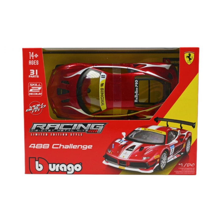 Ferrari 488 Challenge Formula Racing 2017 oryginalny produkt marki Bburago, oficjalny, licencjonowany wzór pojazdu, metalowy model z plastikowymi elementami, perfekcyjne odwzorowanie szczegółów, model z serii KIT - do samodzielnego złożenia. Ruchome elementy: drzwi. Wymiary opakowania: 23 x 10 x 17 cm. Model samochodu do składania bez kleju, z dołączonym śrubokrętem, który posiada polakierowaną metalową karoserię oraz ruchome elementy. Po złożeniu staje się w pełni funkcjonalnym, jeżdżącym pojazdem, idealnym jako zabawka dla dzieci lub model dla kolekcjonerów. Samochód ma otwierane drzwi, a opakowanie zawiera szczegółową instrukcję montażu, ułatwiającą składanie i zapewniającą satysfakcję z tworzenia.