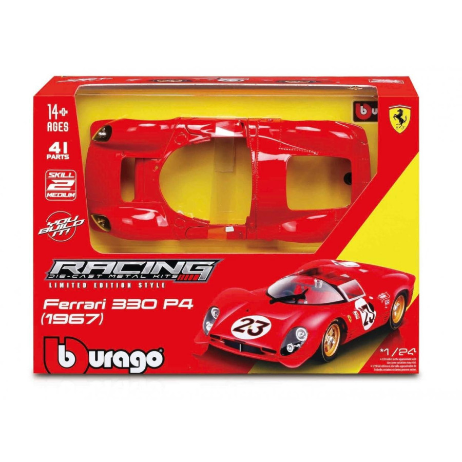 Ferrari 330 P4 Daytona 1967 oryginalny produkt marki Bburago, oficjalny, licencjonowany wzór pojazdu, metalowy model z plastikowymi elementami, perfekcyjne odwzorowanie szczegółów, model z serii KIT - do samodzielnego złożenia. Ruchome elementy: drzwi. Wymiary opakowania: 23 x 10 x 17 cm. Ferrari 330 P4 Daytona to model samochodu do składania bez kleju, z dołączonym śrubokrętem, który posiada polakierowaną metalową karoserię oraz ruchome elementy. Po złożeniu staje się w pełni funkcjonalnym, jeżdżącym pojazdem, idealnym jako zabawka dla dzieci lub model dla kolekcjonerów. Samochód ma otwierane drzwi, a opakowanie zawiera szczegółową instrukcję montażu, ułatwiającą składanie i zapewniającą satysfakcję z tworzenia.