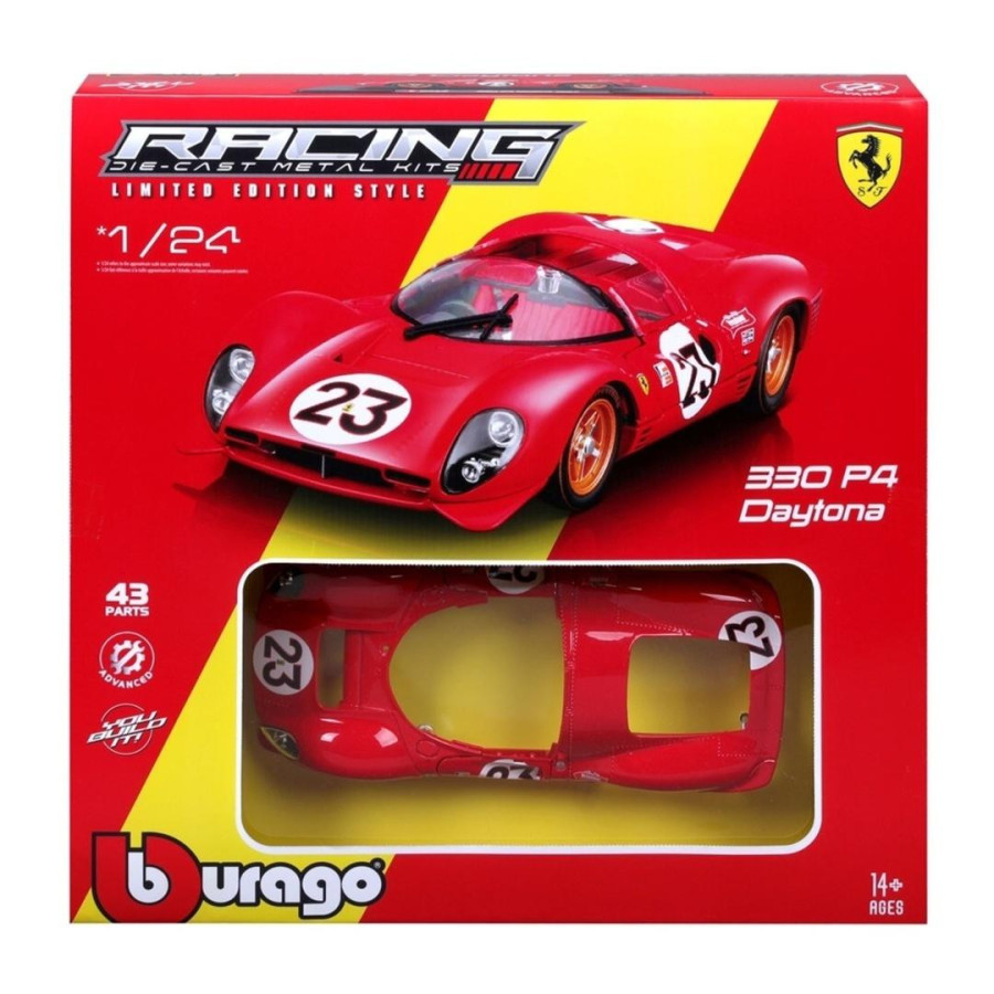Ferrari 330 P4 Daytona 1967 oryginalny produkt marki Bburago, oficjalny, licencjonowany wzór pojazdu, metalowy model z plastikowymi elementami, perfekcyjne odwzorowanie szczegółów, model z serii KIT - do samodzielnego złożenia. Ruchome elementy: drzwi. Wymiary opakowania: 27 x 8 x 22cm. Ferrari 330 P4 Daytona to model samochodu do składania bez kleju, z dołączonym śrubokrętem, który posiada polakierowaną metalową karoserię oraz ruchome elementy. Po złożeniu staje się w pełni funkcjonalnym, jeżdżącym pojazdem, idealnym jako zabawka dla dzieci lub model dla kolekcjonerów. Samochód ma otwierane drzwi, a opakowanie zawiera szczegółową instrukcję montażu, ułatwiającą składanie i zapewniającą satysfakcję z tworzenia.