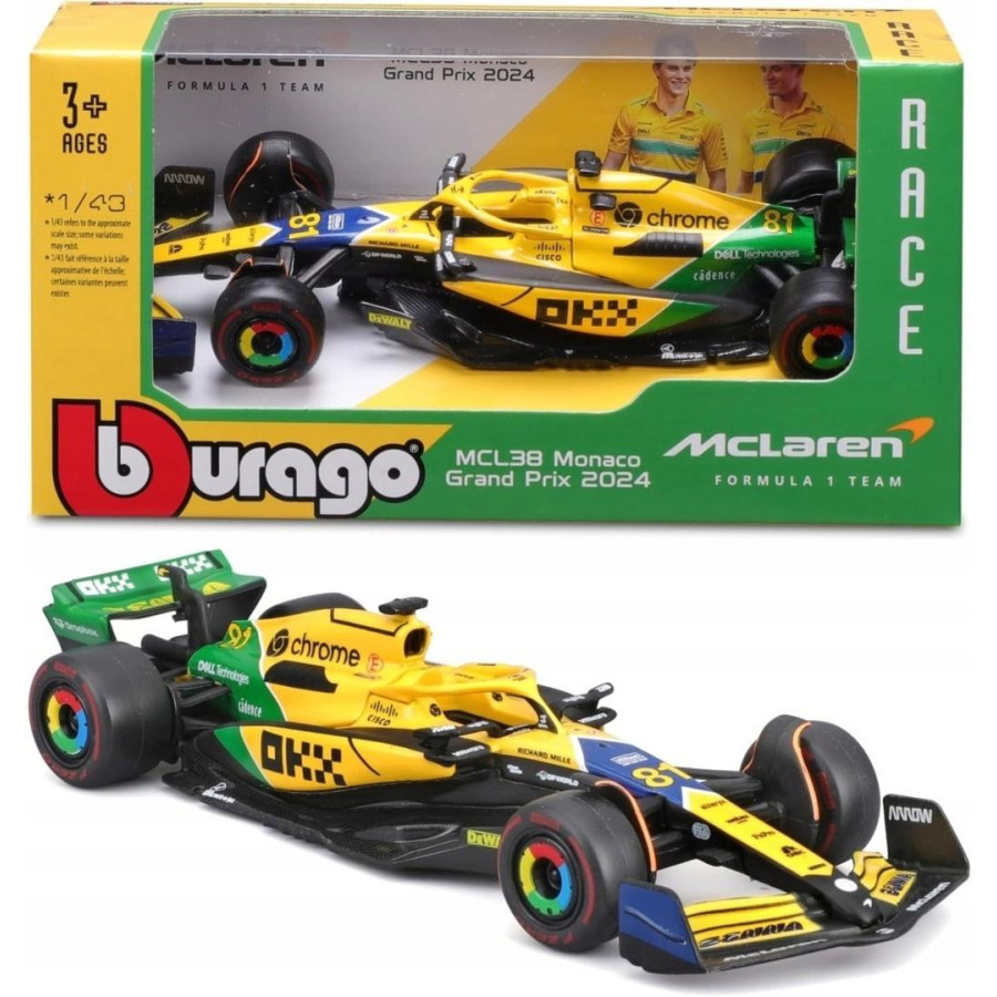 BOLID F1 McLaren MCL38 Monaco GP 2024 #81 Oscar Piastri 1:43 BBURAGO 18-38214 oryginalny produkt marki Bburago, oficjalny, licencjonowany wzór pojazdu, metalowy model z plastikowymi elementami, perfekcyjne odwzorowanie szczegółów. Wymiary: długość 13cm, szerokość 5cm, wysokość 3cm. Wymiary opakowania: 14,5 x 6,5 x 7,5cm. Podczas Grand Prix Monako 2024 zespół McLaren zaprezentował wyjątkowe malowanie bolidu MCL38, oddające hołd Ayrtonowi Sennie w 30. rocznicę jegośmierci. Samochód przybrał barwy inspirowane legendarnym kaskiem Brazylijczyka: żywe odcienie żółci, zieleni i niebieskiego, symbolizujące jego brazylijskie dziedzictwo i niezapomniane osiągnięcia na torze. Inicjatywa \"McLaren SENNA presented by OKX\", zrealizowana we współpracy z marką Senna, objęła nie tylko malowanie bolidu, ale także specjalne kombinezony kierowców Lando Norrisa i Oscara Piastriego oraz stroje całego zespołu.