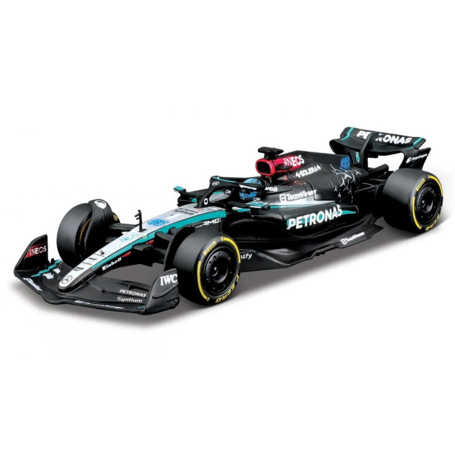 BOLID F1 Mercedes-AMG W15 (2024) #63 George Russell oryginalny produkt marki Bburago, oficjalny, licencjonowany wzór pojazdu, metalowy model z plastikowymi elementami, perfekcyjne odwzorowanie szczegółów, model umieszczony na plastikowej podkładce oraz zamknięty w ochronnej gablotce. Wymiary: długość 13cm, szerokość 5cm, wysokość 3cm. Wymiary opakowania: 14,5 x 7 x 7cm. Mercedes-AMG F1 W15 E Performance to bolid Formuły 1 na sezon 2024, będący efektem gruntownej przebudowy po rozczarowującym sezonie 2023. W15 otrzymał nowe podwozie i obudowę skrzyni biegów, zmieniono również konfigurację tylnego zawieszenia z pull-rod na push-rod, co poprawiło stabilność tylnej osi, będącej wcześniej źródłem problemów. Aerodynamika została zoptymalizowana poprzez przeprojektowanie nosa i przedniego skrzydła, a także zastosowanie innowacyjnych bocznych wlotów powietrza w kształcie litery P. W15 napędzany jest przez hybrydową jednostkę napędową Mercedes-AMG F1 M15 E Performance. W sezonie 2024 bolid odniósł cztery zwycięstwa, w tym triumfy Hamiltona na torach Silverstone i Spa, oraz Russella w Austrii i Las Vegas, co zapewniło zespołowi czwarte miejsce w klasyfikacji konstruktorów .