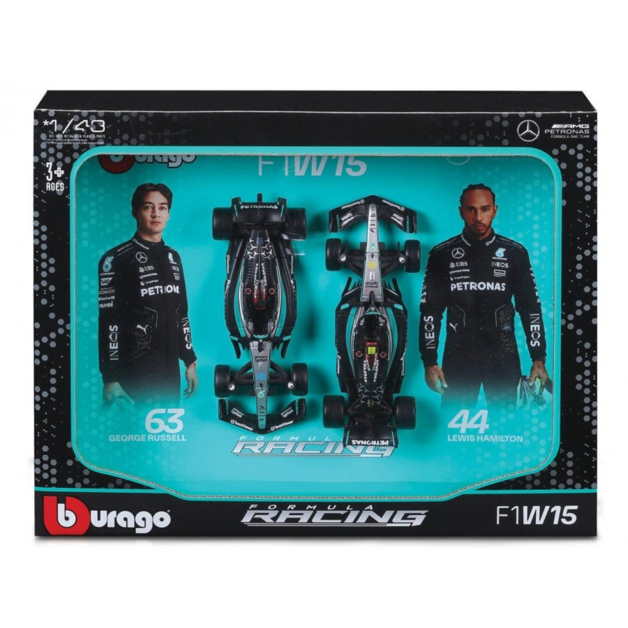 BOLIDY F1 Mercedes-AMG Petronas W15 oryginalny produkt marki Bburago, oficjalny, licencjonowany wzór pojazdu, metalowy model z plastikowymi elementami, perfekcyjne odwzorowanie szczegółów. W zestawie dwa pojazdy: Mercedes-AMG W15 (2024) #44 Lewis Hamilton, Mercedes-AMG W15 (2024) #63 George Russell. Wymiary modelów: długość 13cm, szerokość 5cm, wysokość 3cm. Zestaw prezentowy Bburago w skali 1:43 to idealny wybór dla każdego fana Formuły 1 . W eleganckim, efektownym opakowaniu znajdują się dwa wiernie odwzorowane bolidy. Modele zachwycają dbałością o detale, realistycznym malowaniem i autentycznymi logotypami sponsorów, co czyni je wyjątkowym dodatkiem do każdej kolekcji modeli. Zestaw świetnie sprawdzi się jako prezent:zarówno dla dzieci od 3. roku życia, jak i dla dorosłych kolekcjonerów oraz entuzjastów Formuły 1. Dzięki efektownej oprawie graficznej i obecności podobizn kierowców w oficjalnych strojach wyścigowych, pudełko samo w sobie prezentuje się jak eksponat i nie wymaga dodatkowego opakowania.