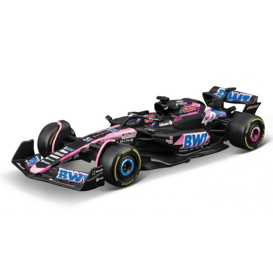 BOLID F1 BWT Alpine A524 (2024) #31 Esteban Ocon oryginalny produkt marki Bburago, oficjalny, licencjonowany wzór pojazdu, metalowy model z plastikowymi elementami, perfekcyjne odwzorowanie szczegółów, model umieszczony na plastikowej podkładce oraz zamknięty w ochronnej gablotce. Wymiary: długość 13cm, szerokość 5cm, wysokość 3cm. Wymiary opakowania: 14,5 x 7 x 7cm. Bolid Alpine A524 to konstrukcja zespołu BWT Alpine F1 Team na sezon Formuły 1 2024, która wprowadza kilka interesujących rozwiązań. Zaprojektowany z myślą o dwóch kolejnych sezonach, A524 charakteryzuje się całkowicie nowym monokokiem z włókna węglowego i aluminium o strukturze plastra miodu, co zapewnia maksymalną wytrzymałość przy minimalnej masie. Bolid napędza jednostka Renault E-Tech 2024, generująca ponad 950 KM, a jego maksymalna prędkość wynosi 355 km/h. Malowanie, stworzone we współpracy z artystą Felipe Pantone, łączy czerń z alpejskim błękitem i różem BWT, choć dominuje włókno węglowe, co budzi mieszane uczucia.