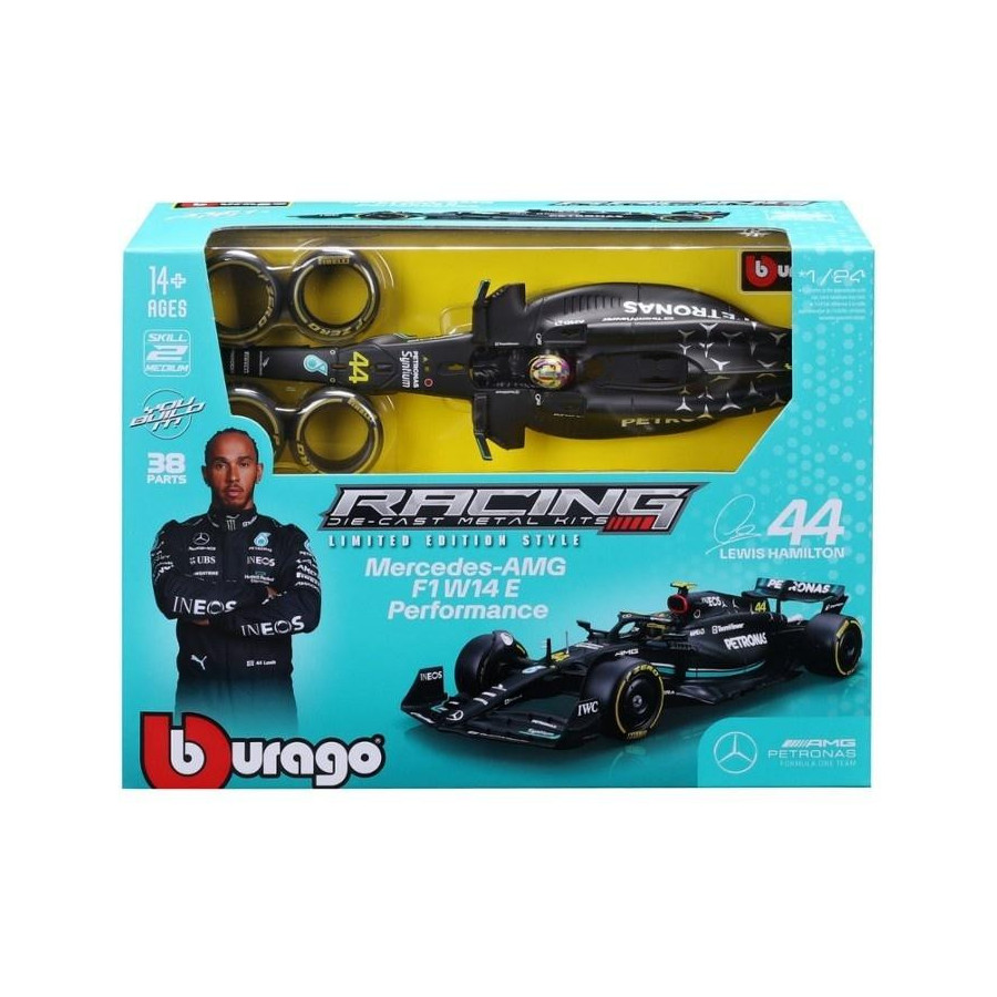 BOLID F1 Mercedes-AMG W14 E Performance (2023) #44 Lewis Hamilton oryginalny produkt marki Bburago, oficjalny, licencjonowany wzór pojazdu, metalowy model z plastikowymi elementami, perfekcyjne odwzorowanie szczegółów, model z serii KIT - do samodzielnego złożenia. Model samochodu do składania bez kleju, z dołączonym śrubokrętem, który posiada polakierowaną karoserię oraz ruchome elementy. Po złożeniu staje się w pełni funkcjonalnym, jeżdżącym pojazdem, idealnym jako zabawka dla dzieci lub model dla kolekcjonerów. Opakowanie zawiera szczegółową instrukcję montażu, ułatwiającą składanie i zapewniającą satysfakcję z tworzenia.