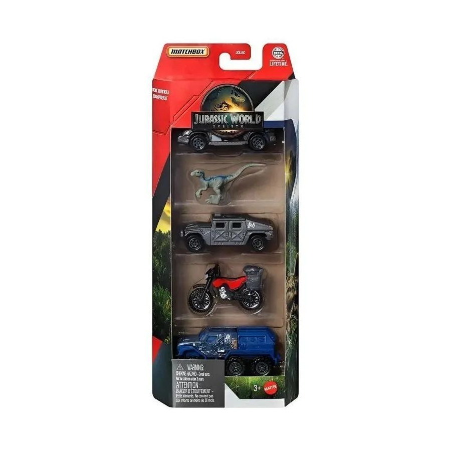 Matchbox Jurassic World Samochody zabawki i dinozaur 5-pak zabawek, zestaw z 4 metalowymi pojazdami w skali 1:64 i 1 dinozaurem z serii filmowej (style mogą się różnić)