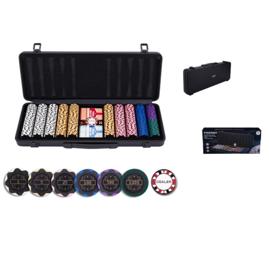 Zestaw do pokera zawiera dwie talie kart, 500 żetonów (z wartością), 1 metalowy żeton rozdającego, pięć kości i czarne aluminiowe etui z zaokrąglonymi rogami. - 150 x 1 EUR - 150 x 5 EUR - 100 x 25 EUR - 50 x 100 EUR - 25 x 500 EUR - 25 x 1000 EUR