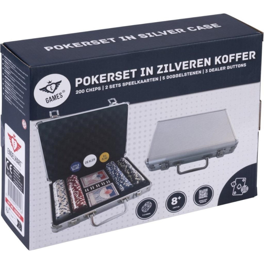 Zestaw do gry w pokera składający się z 200 żetonów o masie 11,5 g, dwóch talii kart, aluminiowanej walizki, kości i dealer butonów