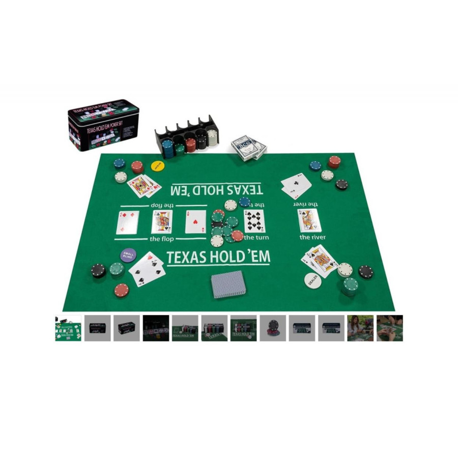 Zestaw do pokera zawiera matę do gry, dwie talie kart, 200 żetonów, dealer button, small i big blind oraz zasady gry. Zestaw jest dostarczany w blaszanym pudełku.