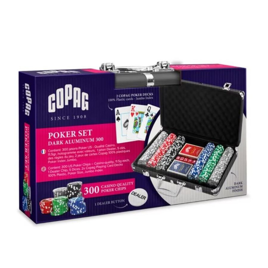 Czarna metalowa walizka, 300 żetonów US z hologramem i nominałami (50 zielonych żetonów pokerowych / 50 czarnych żetonów pokerowych / 50 niebieskich żetonów pokerowych / 100 szarych żetonów pokerowych / 50 czerwonych żetonów pokerowych?). Dwie talie kart COPAG(R) Jumbo Face - 4 PK, 1 akrylowy żeton dealera 65x12mm, 5 kostek i 1 wielojęzyczna instrukcja z zasadami gry.