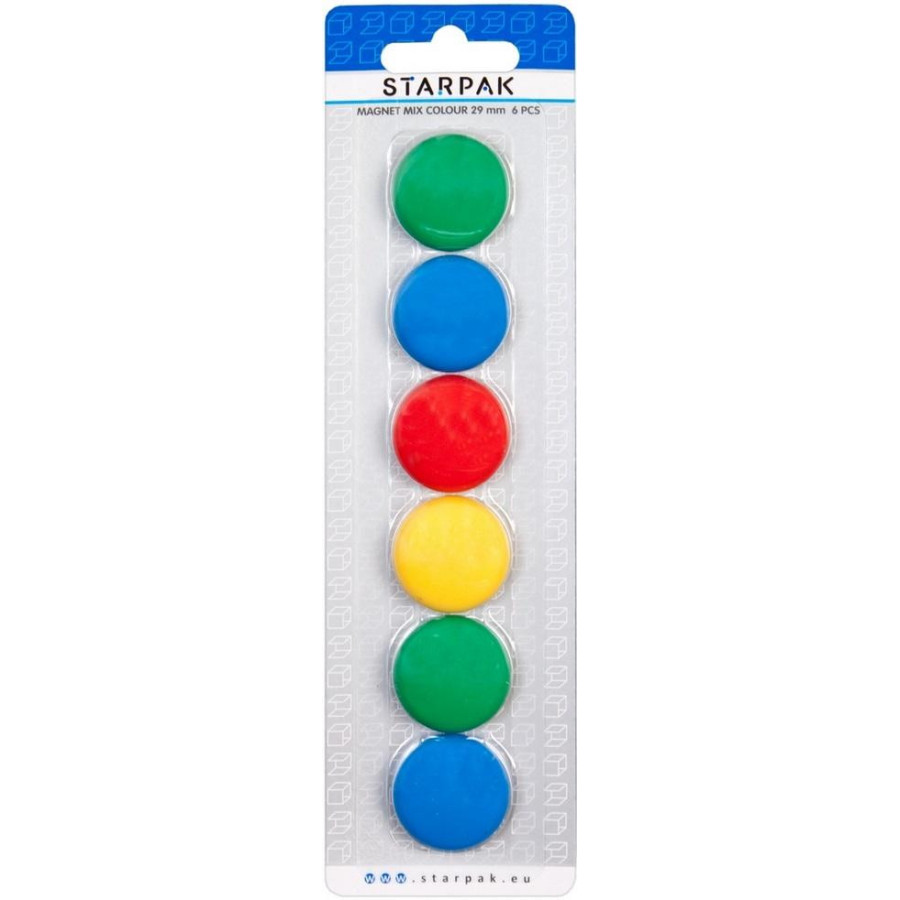 Zestaw magnesów w 4 kolorach: niebieskim, żółtym, czerwonym i zielonym. Pakowane w blister po 6 szt. Przydatne w biurze, domu, pracy.