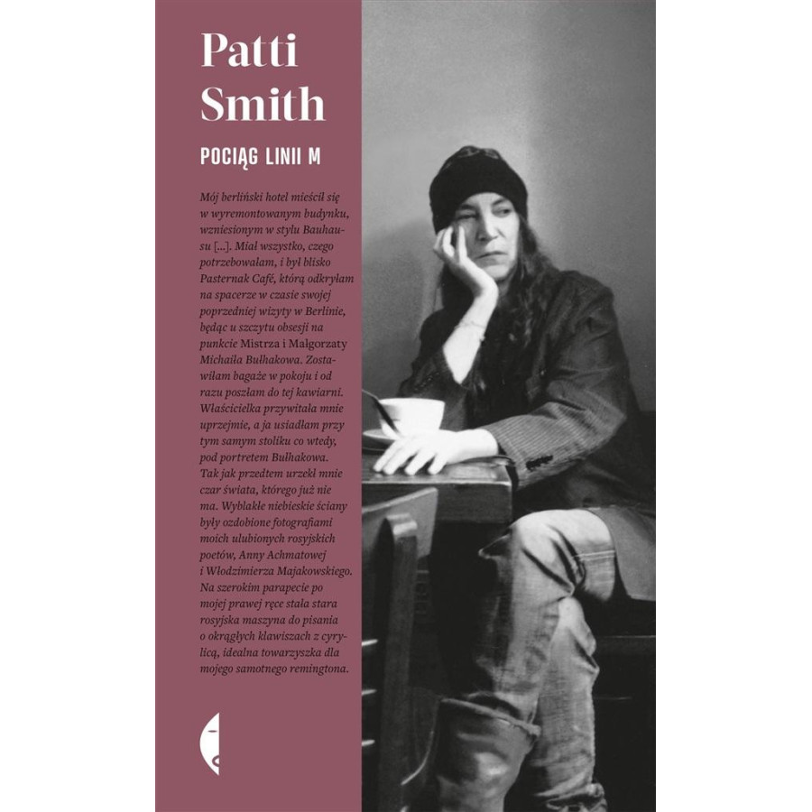 Nałogowo opisuje świat wokół: notuje wrażenia z podróży, wspomina bliskich, przytacza anegdoty i wprowadza w świat ulubionych książek. Znana z żywiołowych koncertów, fascynuje pasją życia, otwartością i wrażliwością, nieobce są jej też melancholia i lęk. Jej "Pociąg linii M" kursuje wahadłowo pomiędzy przeszłością a teraźniejszością, między jawą a snem, między fikcją a prawdą, a z kawiarnianych zapisków Patti Smith wyłania się zaskakująco osobisty i spójny portret ikony amerykańskiej popkultury.